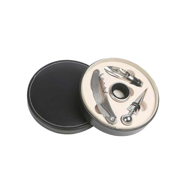 Set de vino redondo con accesorios metálicos, el compañero perfecto para los amantes del vino. Este set completo y elegante incluye todos los elementos esenciales para disfrutar y servir el vino de manera sofisticada. Cuenta con sacacorchos, boquilla, corcho metálico y cortagotas, este set te brinda todas las herramientas necesarias para una experiencia de vino excepcional.