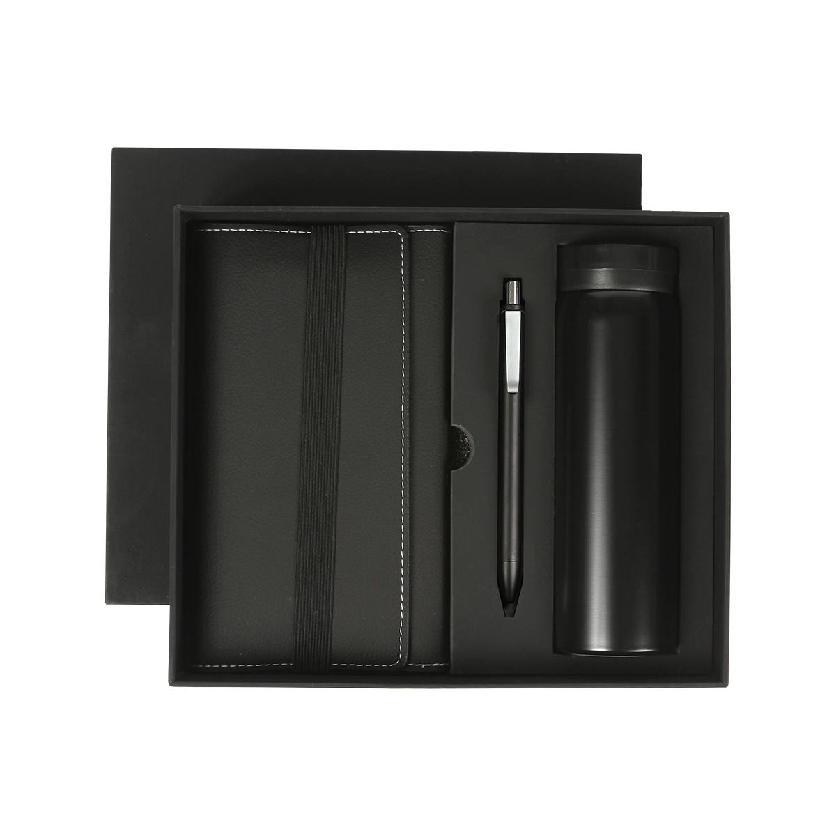 Set ejecutivo, incluye libreta con cubierta fabricada en curpiel con 80 hojas de 70g, bolígrafo con barril plástico de apariencia metálical y termo de doble pared fabricado en acero inoxidable. Incluye caja de regalo color negro.