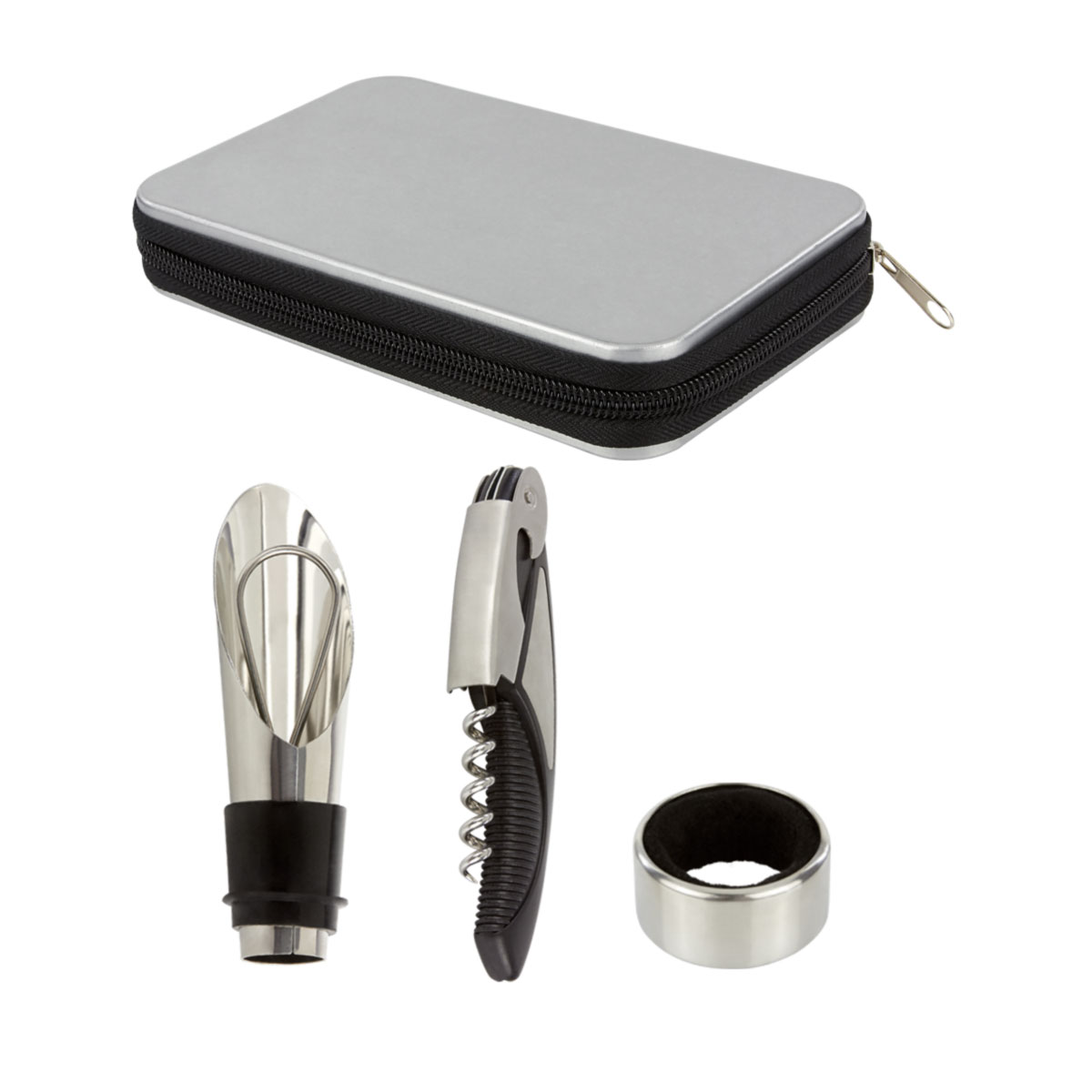 Incluye sacacorchos con navaja y destapador, arillo, boquilla, y estuche.