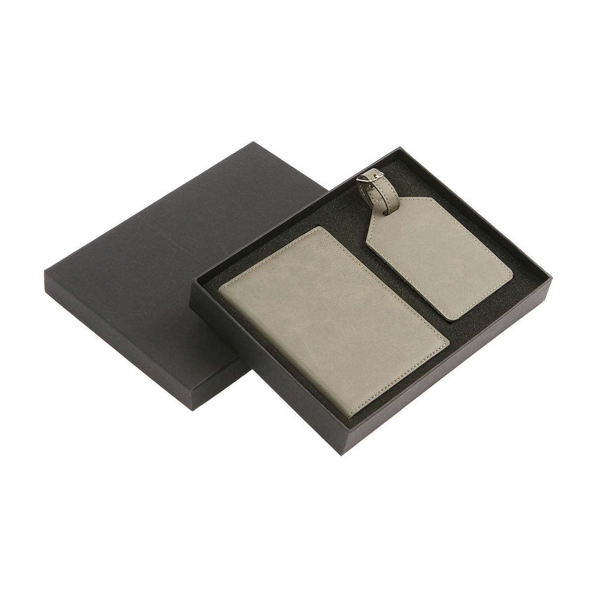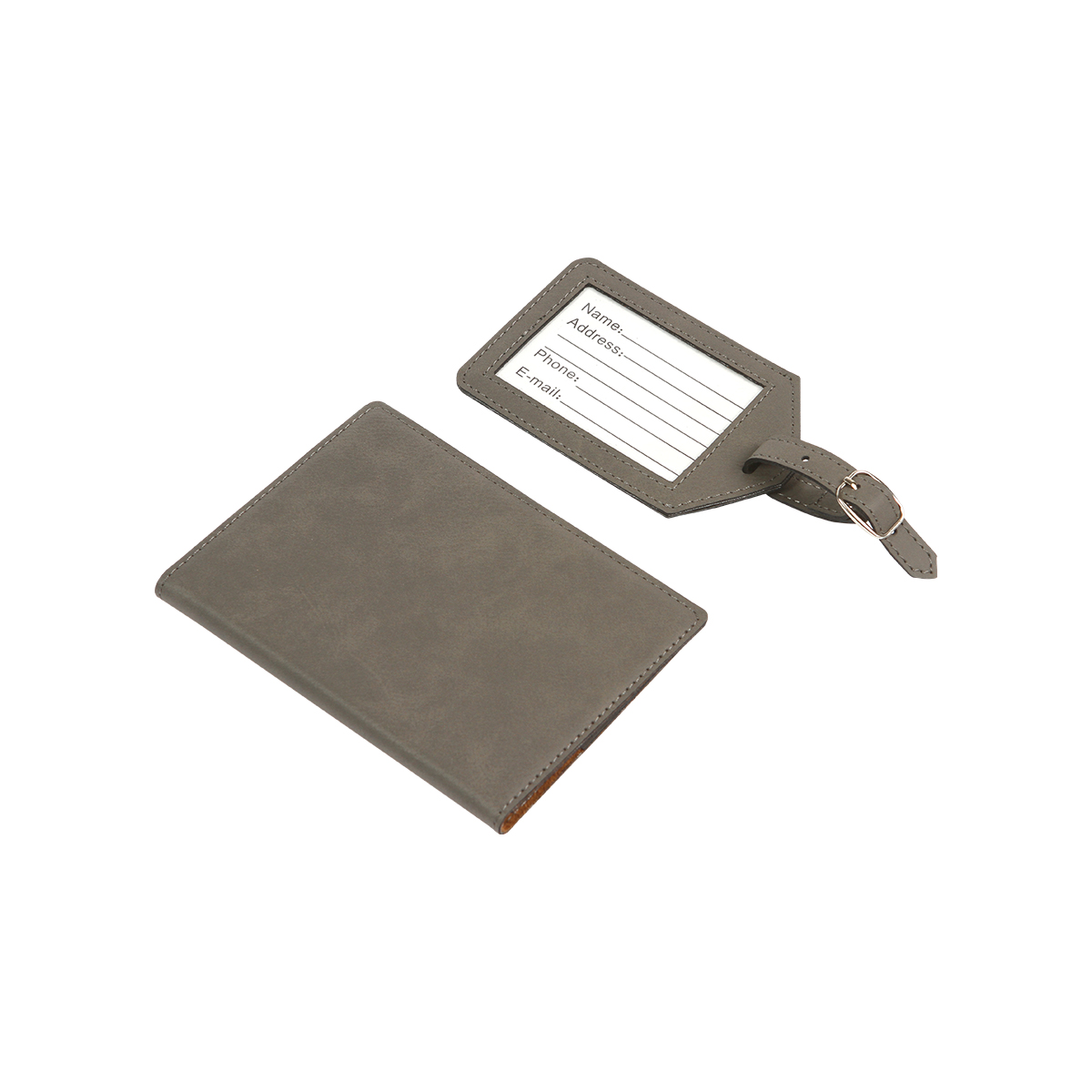 Set de regalo incluye un porta pasaportes y un identificador de maleta fabricados en curpiel. El identificador rectangular tiene una correa ajustable.