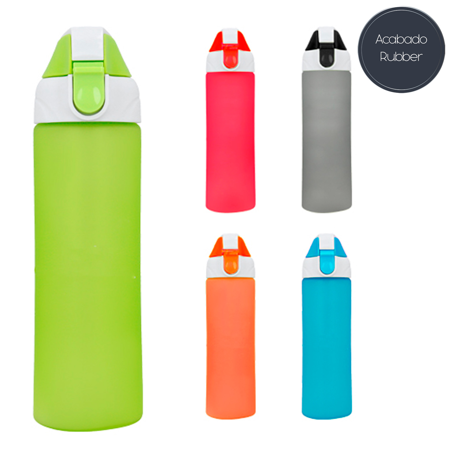Cilindro de plástico rubber, con colador, tapa de seguridad y cinta de poliéster para una mejor sujeción.