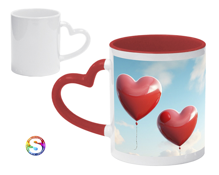 Tarro de sublimación de cerámica blanco con asa en forma de corazón. El interior y el asa son del mismo color. CAP. 325 ml. (11 OZ). Venta en múltiplos de 12.
