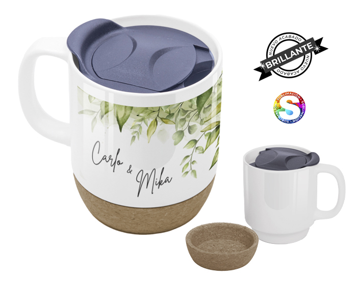 Taza de cerámica para sublimación acabado brillante. Cuenta con base de corcho removible y tapa a presión con seguro deslizable. CAP. 355 ml. (12 OZ). Presentación: Caja en color kraft.