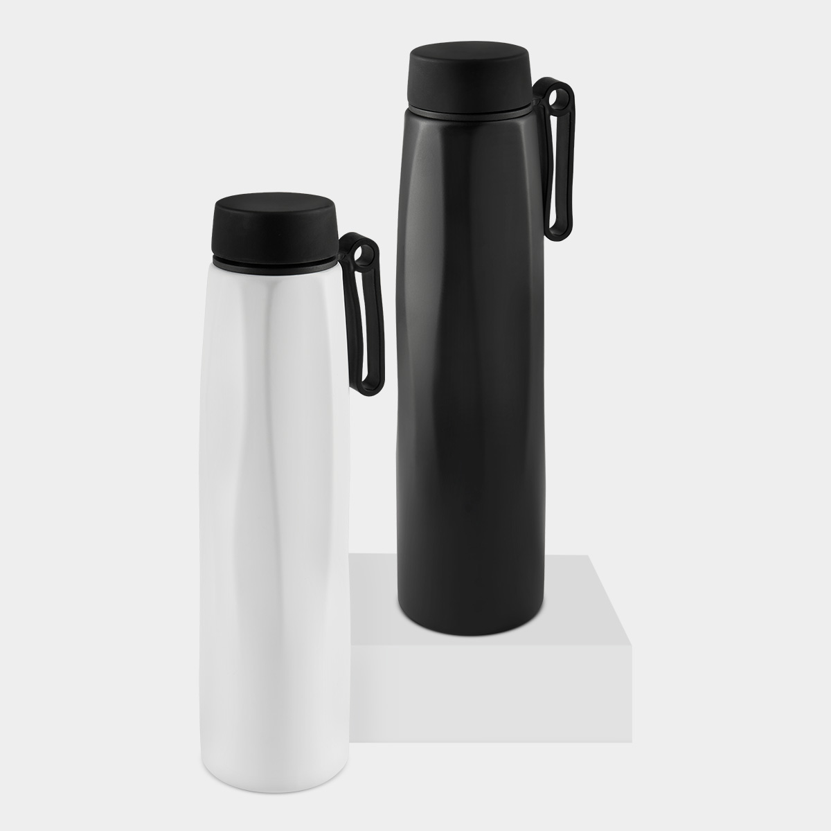 Doble pared. Cerrado al vacío. Pared interna y externa acero inoxidable. Tapa de rosca con terminado rubber para grabado efecto espejo. Incluye asa y caja individual.