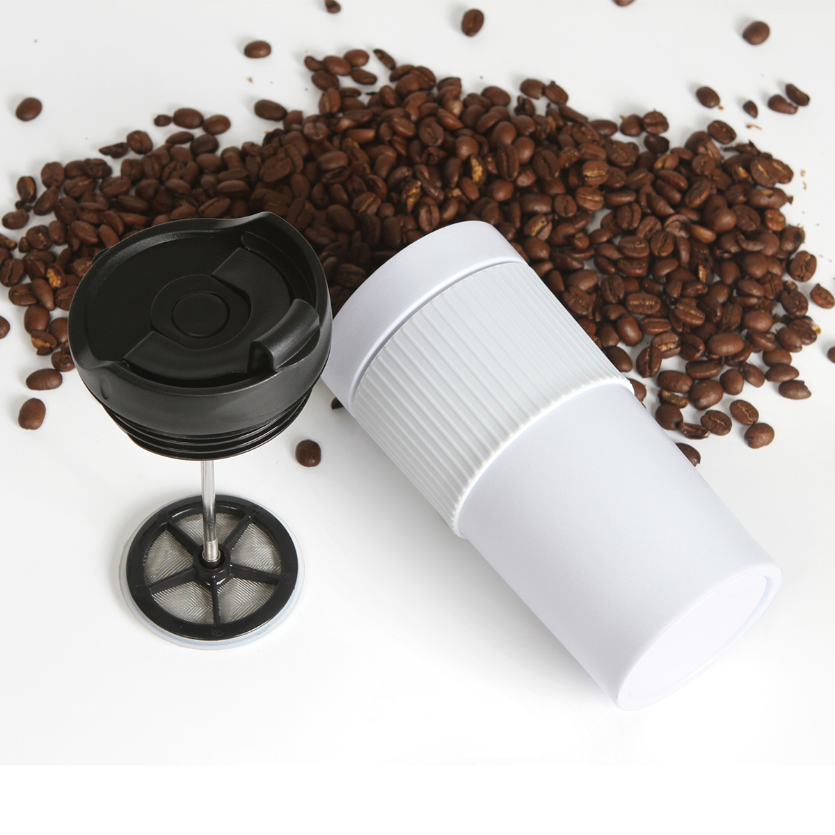 Termo de doble pared de acero inoxidable con manga de silicón con prensa francesa de acero inoxidable, tapa hermética anti derrame con cubierta de seguridad, fabricado en materiales de grado alimenticio, mantiene bebidas calientes por un largo tiempo, no usar en microondas. Capacidad de 480 ml. Incluye caja de cartón individual.