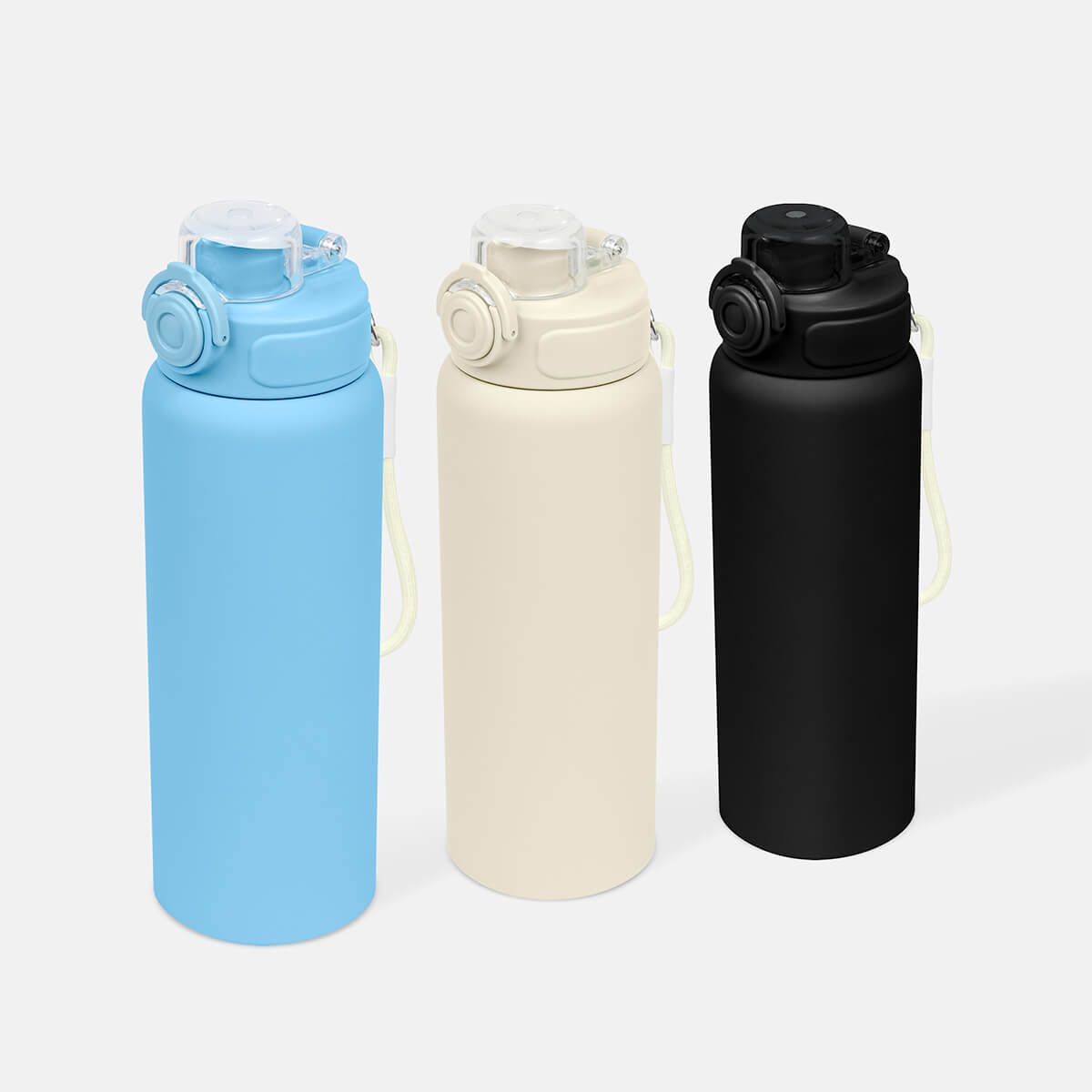 Termo doble pared. Cerrado al vacío. Pared interna y externa de acero inoxidable. Cuerpo con terminado tipo rubber, que lo hace suave al tacto. Tapa con cierre de rosca y sobre tapa tipo push para mantenerla seguro y limpio. Además con su nuevo diseño de boquilla, ofrece dos alternativas de uso, para beber normal o por medio de popote, ambas en la misma boquilla, sin ranuras adicionales. Mantiene temperatura caliente y fría por 8 hrs. Capacidad 27 Oz. Incluye asa de poliéster, popote de plástico y caja individual.