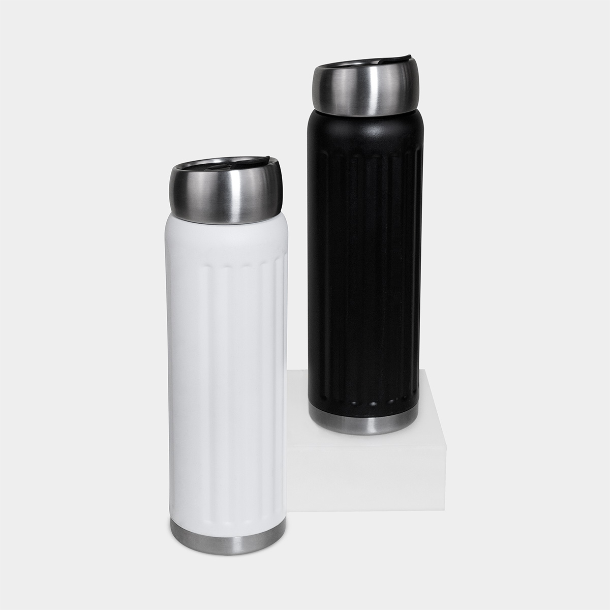 Doble pared. Cerrado al vacío. Pared interna y externa acero inoxidable. Tapa metálica con sistema de rosca. Sobre tapa de plástico con sistema de push. Terminado rugoso. Mantiene temperatura caliente 6 hrs y temperatura fría 12 hrs aproximadamente. Incluye caja individual
