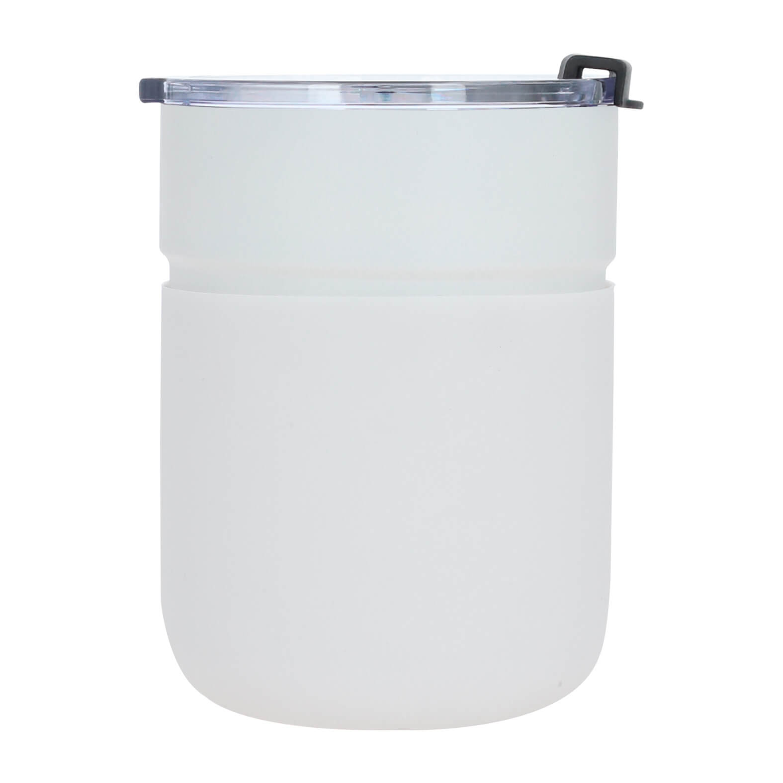 Termo con doble pared de acero inoxidable, insulado al vacío, acabado rugoso, con manga de silicón y tapa de cierre a presión.