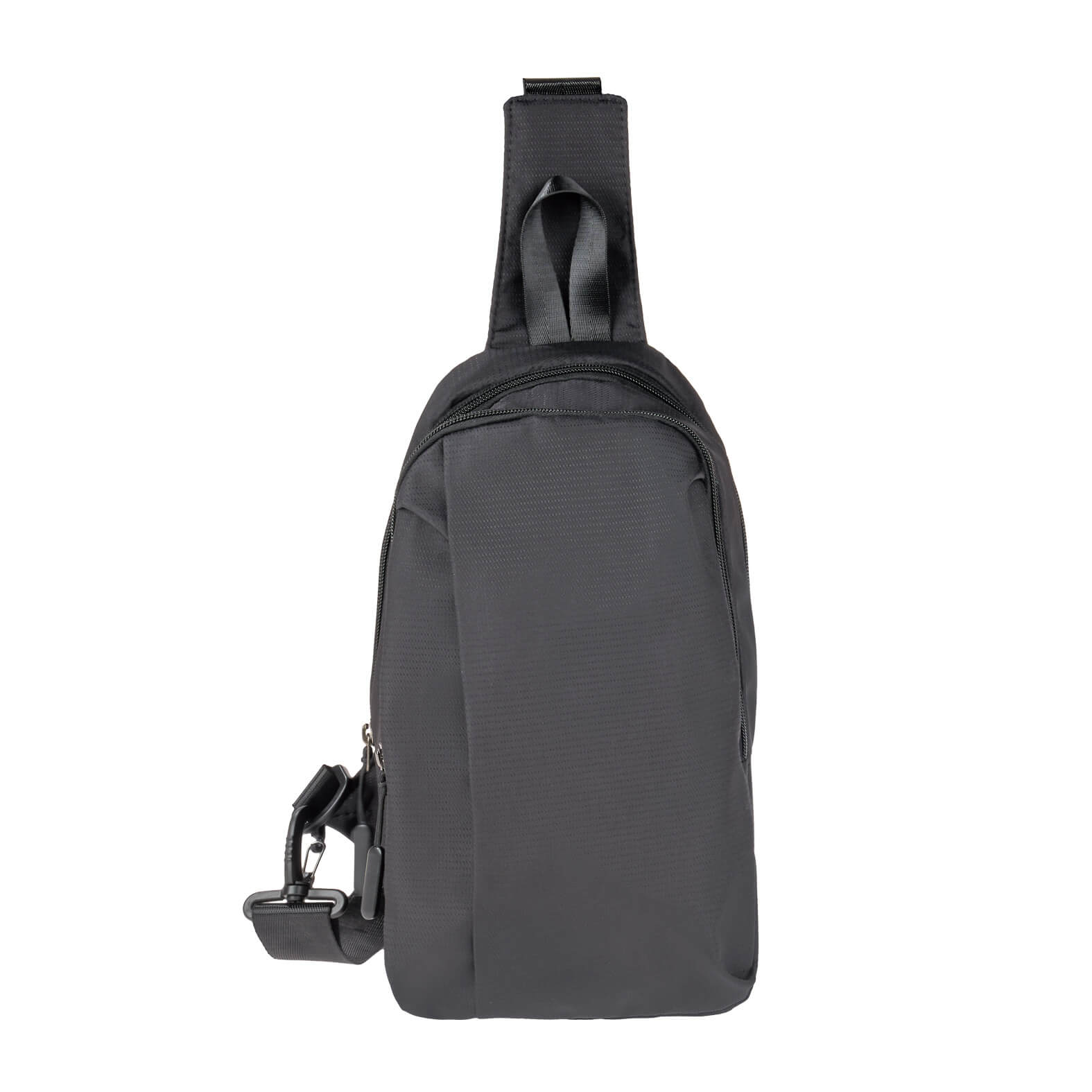 Bolsa de hombro de poliéster con compartimento principal, dos bolsillos frontales con cierre y correa ajustable.