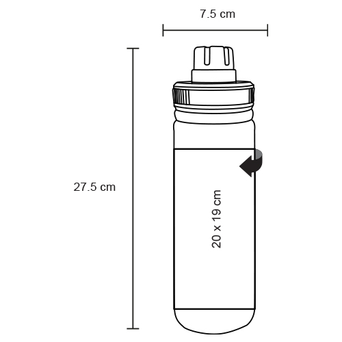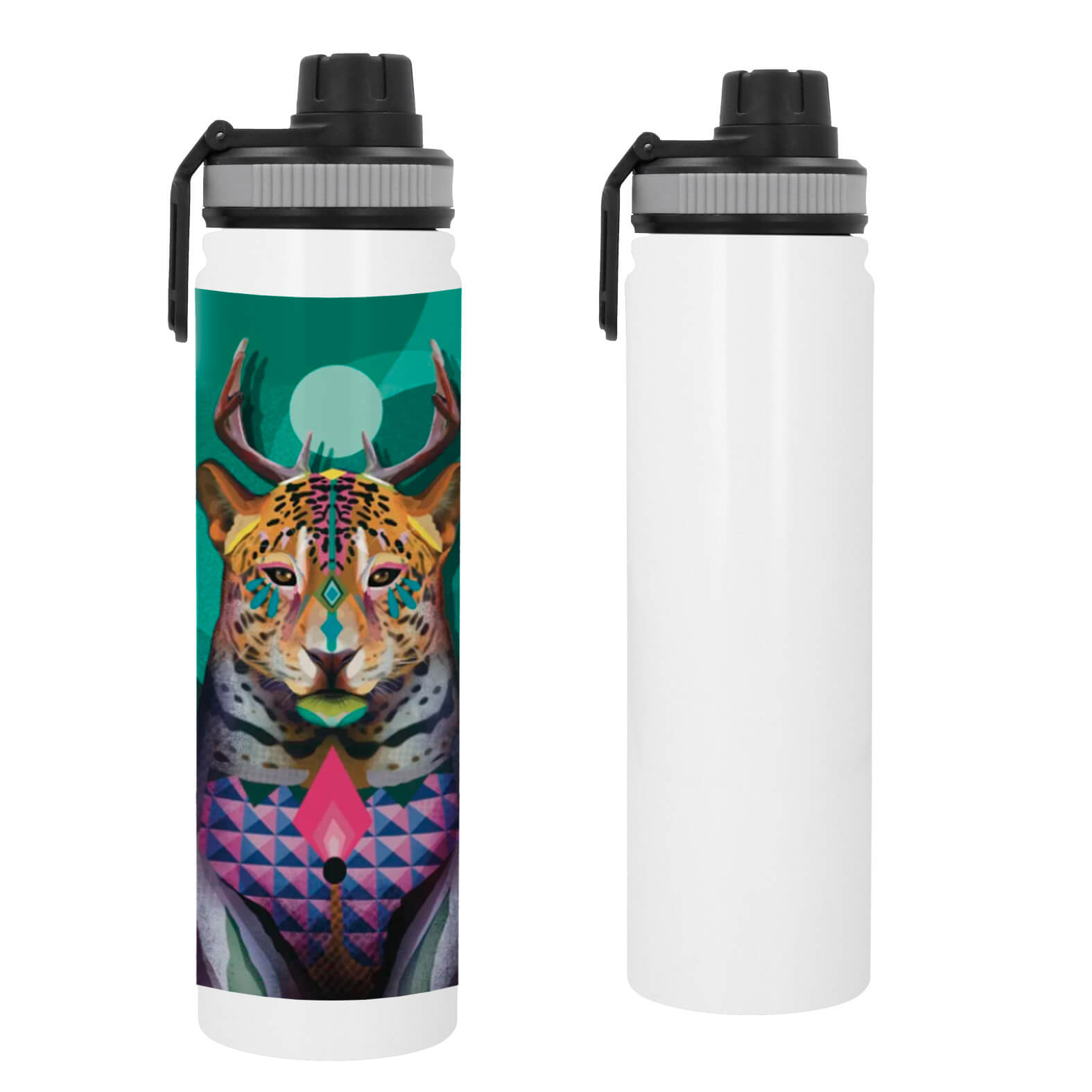 Termo sublimable de acero inoxidable y doble pared insulado al vacío. Cuenta con tapa de rosca con asa de plástico para sujetarlo fácilmente.
