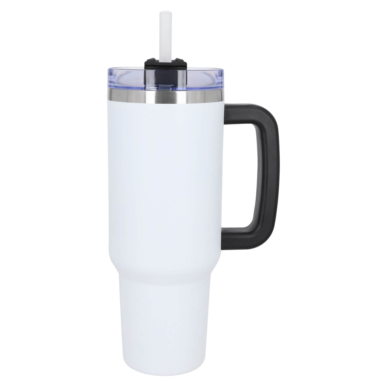 Termo con doble pared de acero inoxidable, insulado al vacío, acabado rugoso, con asa lateral y tapa enroscable con popote.