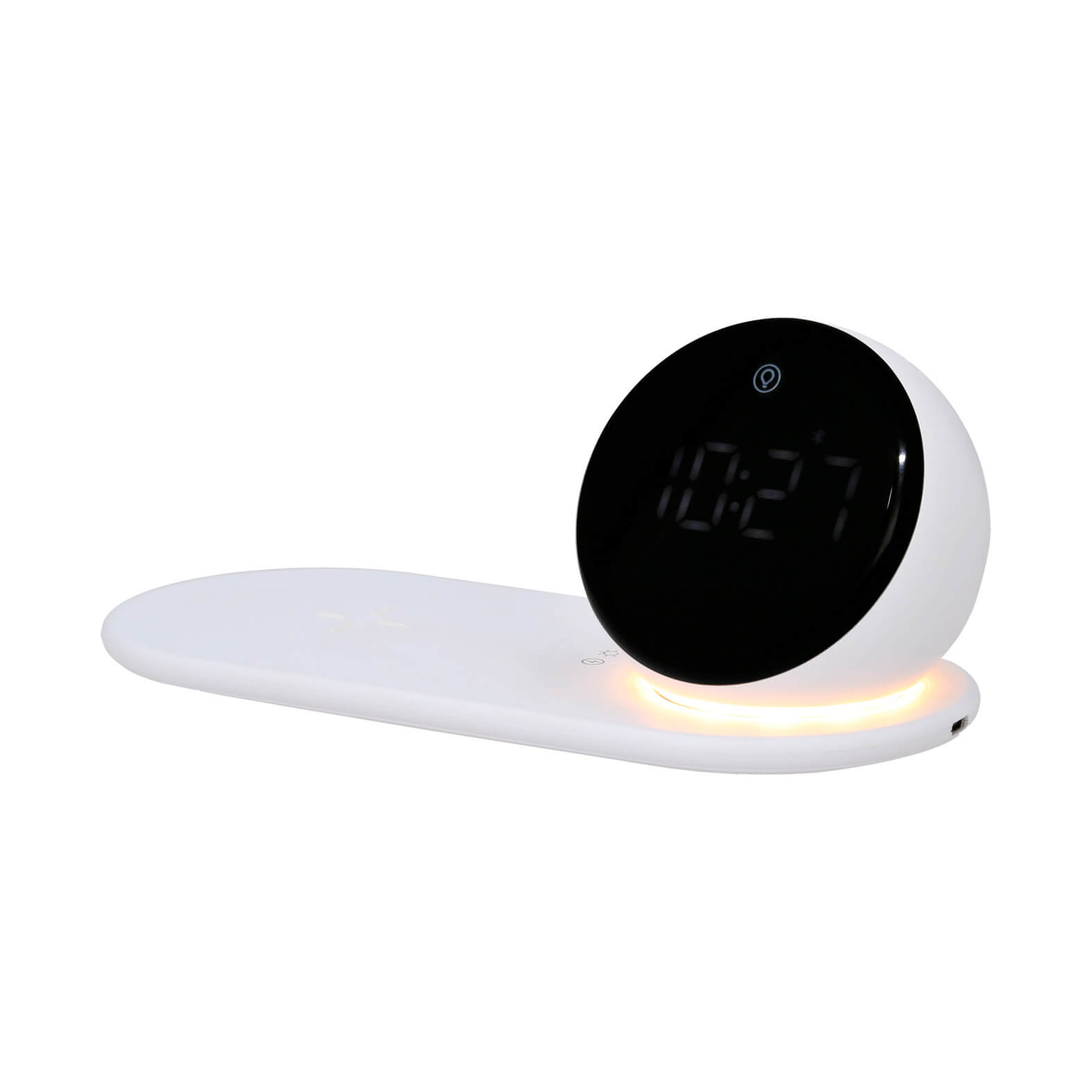 Cargador inalámbrico con alarma digital, bluetooth, bocina y lámpara de noche con tres modalidades. Incluye cable de carga tipo C. (Compatible con dispositivos con tecnología Qi).