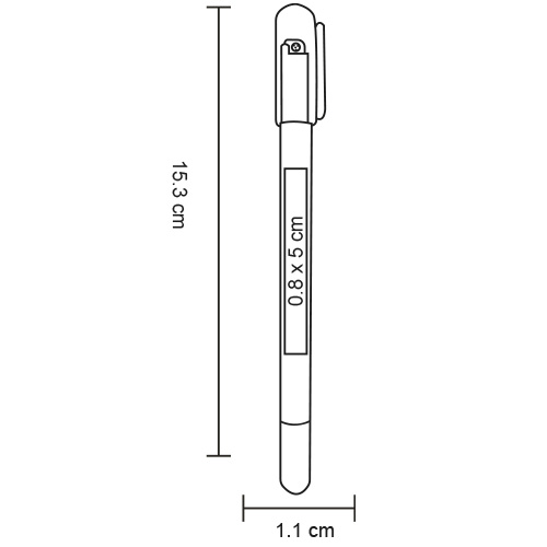 Bolígrafo de plástico con punta fina en el extremo inferior y sello de línea con figura de balón en el extremo superior.