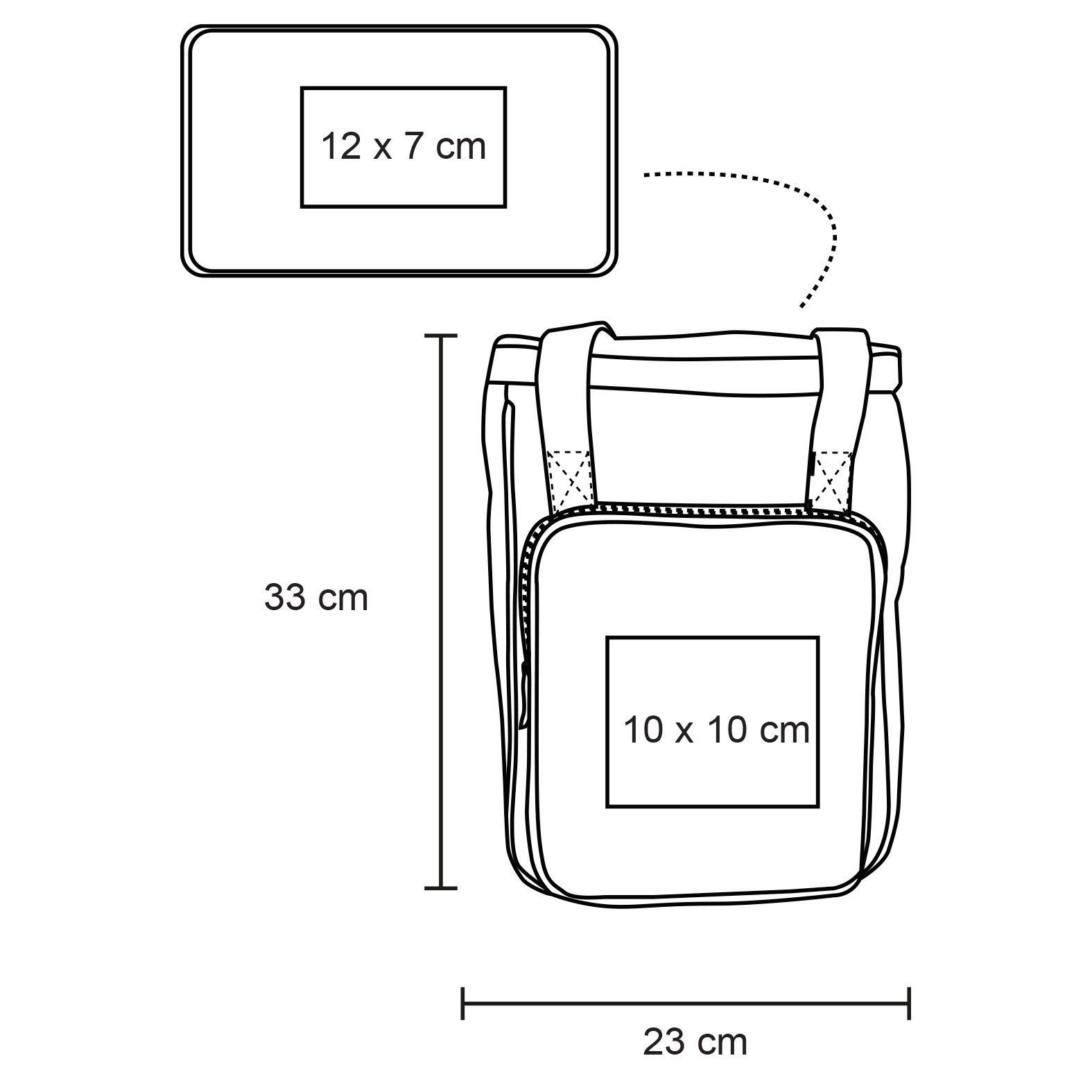 Hielera con interior plastificado, sellado en compartimento principal, un compartimento secundario con cierre, malla lateral y asas superiores.